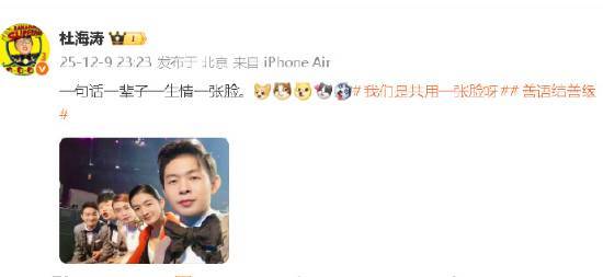 12月9日,杜海涛在微博发布内容“一句话一辈子一生情一张脸”,同时附上话题#我们是共用一张脸呀#,通过自嘲的方式回应并接纳了外界的调侃。