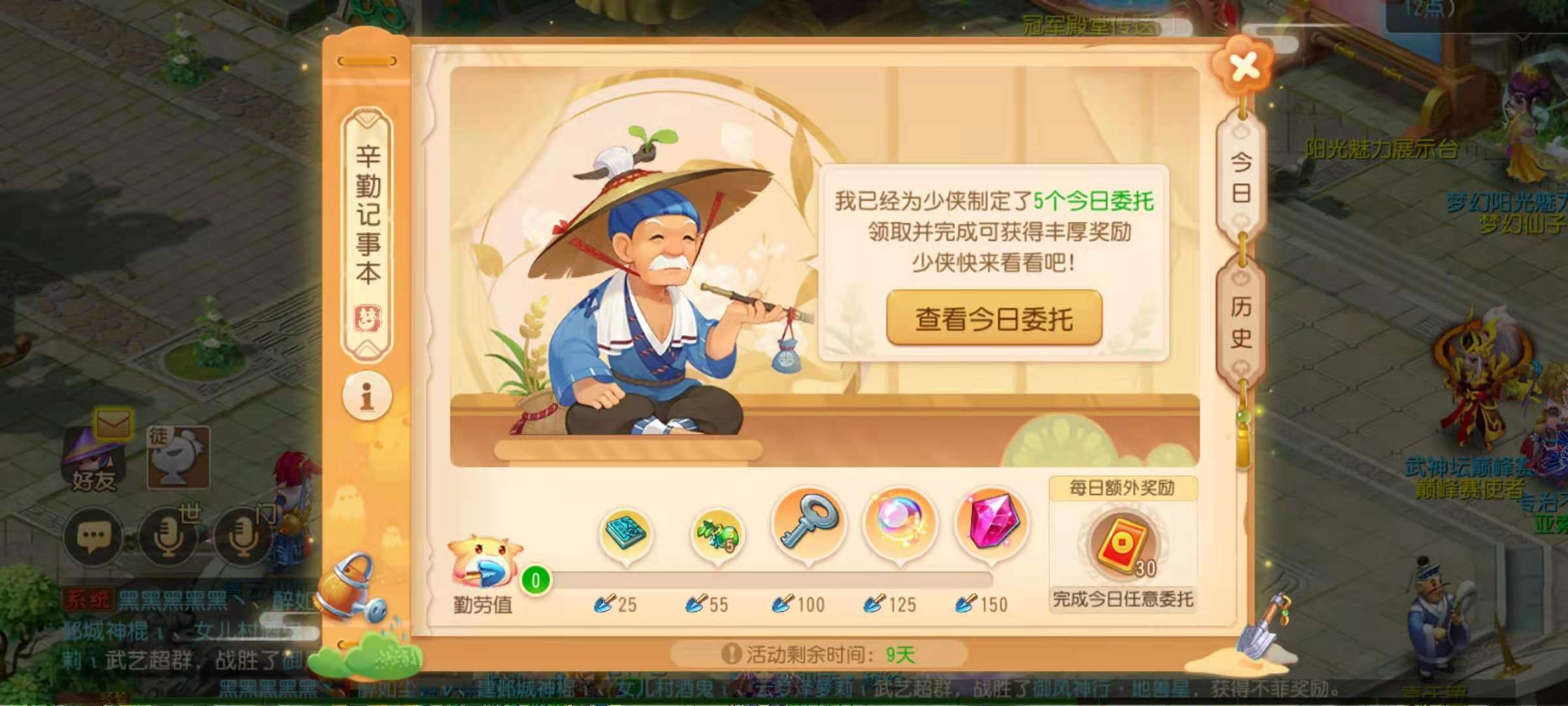玩家可前往长安城台子处,找到劳动之星(劳动节活动大使)参与领取辛勤记事本的活动。该活动大使每日会为玩家准备5个委托任务,玩家完成相应任务即可获取勤劳值,当勤劳值累积到一定数量时,就能兑换对应的奖励。玩家每天需要选择2个普通委托和3个挑战委托,且各类委托任务的数量均有限制,一旦领取委托任务,对应的任务次数就会被扣除。委托任务会在每天晚上12点进行重置,因此玩家需在当天完成已领取的委托任务。