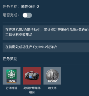 :累计成功带出6件品质≥紫色的工具材料类收集品;在特勤处成功生产1次【HVK-2防弹衣】;