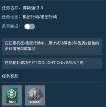 :累计成功带出8件品质≥紫色的情报资料类收集;在特勤处成功生产2次【OLIGHT Odin S战术手电】;