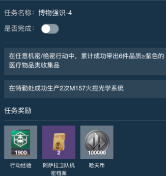 :累计成功带出6件品质≥紫色的医疗物品类收集品;在特勤处成功生产2次【M157火控光学系统】;