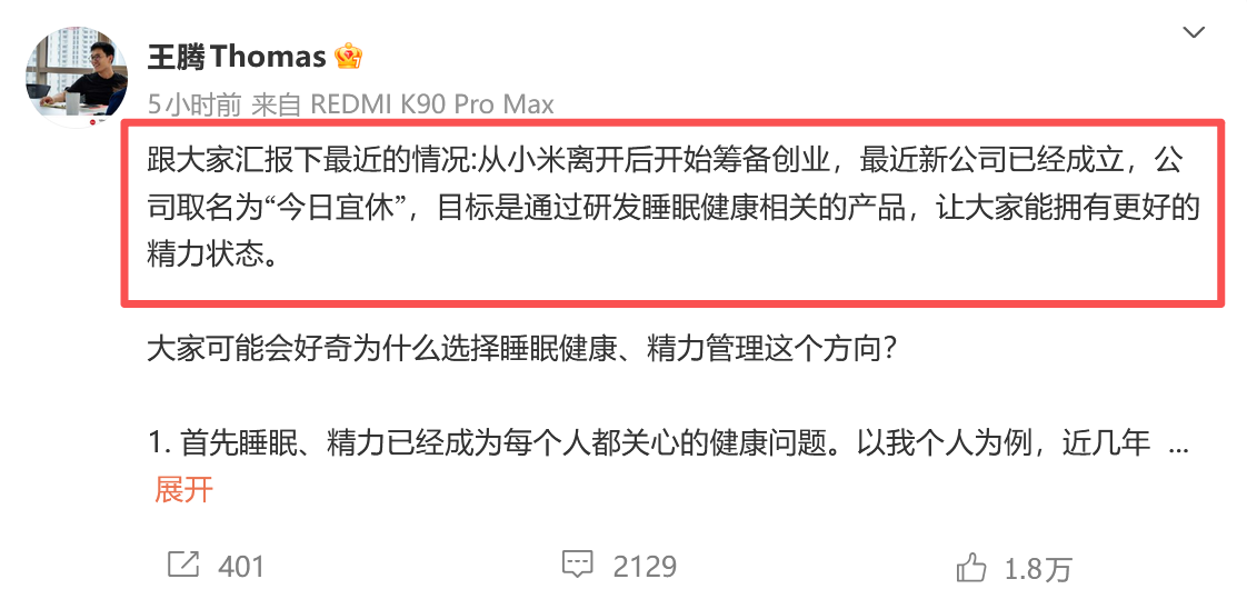 今天一大早,王腾创业的消息就登上了微博热搜第二名。小雷仔细一看,发现他要自己当老板了,新公司叫“今日宜休”,主要做睡眠健康领域的业务。从去年9月离开小米,到现在确定新方向并宣布创业,王腾的效率确实很高。