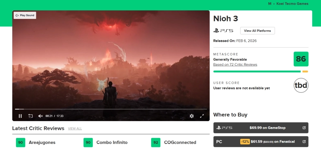 《仁王3》媒体评分出炉:M站均分87分,堪称武士幻想题材的巅峰之作