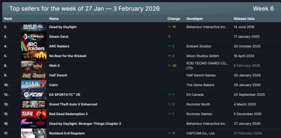 Steam周销量排行榜公布:《仁王3》热度高涨冷门佳作《孤山独影》跻身前十